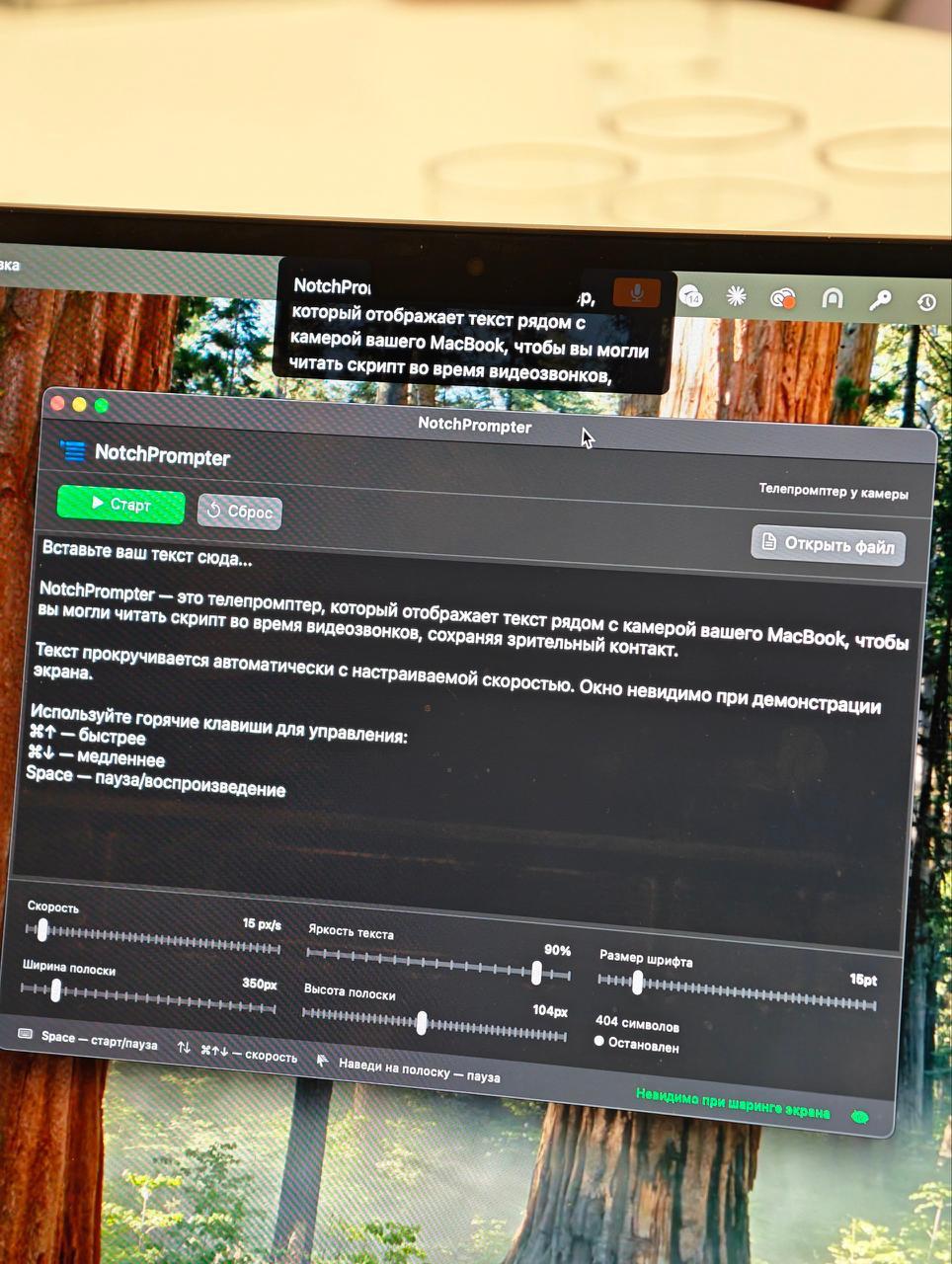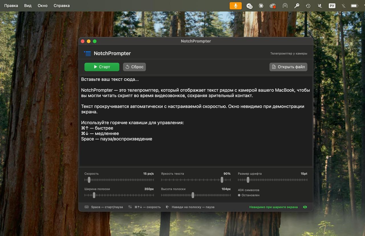 По работе ему нужно снимать рекламные видеоролики, где важно постоянно смотреть прямо в камеру. Если текст длинный, учить его наизусть — сомнительное удовольствие. Для таких задач есть готовые тулзы вроде Notchscript: это суфлёр, который аккуратно прячется под вырез камеры макбука, так что ты читаешь текст и не отводишь взгляд.